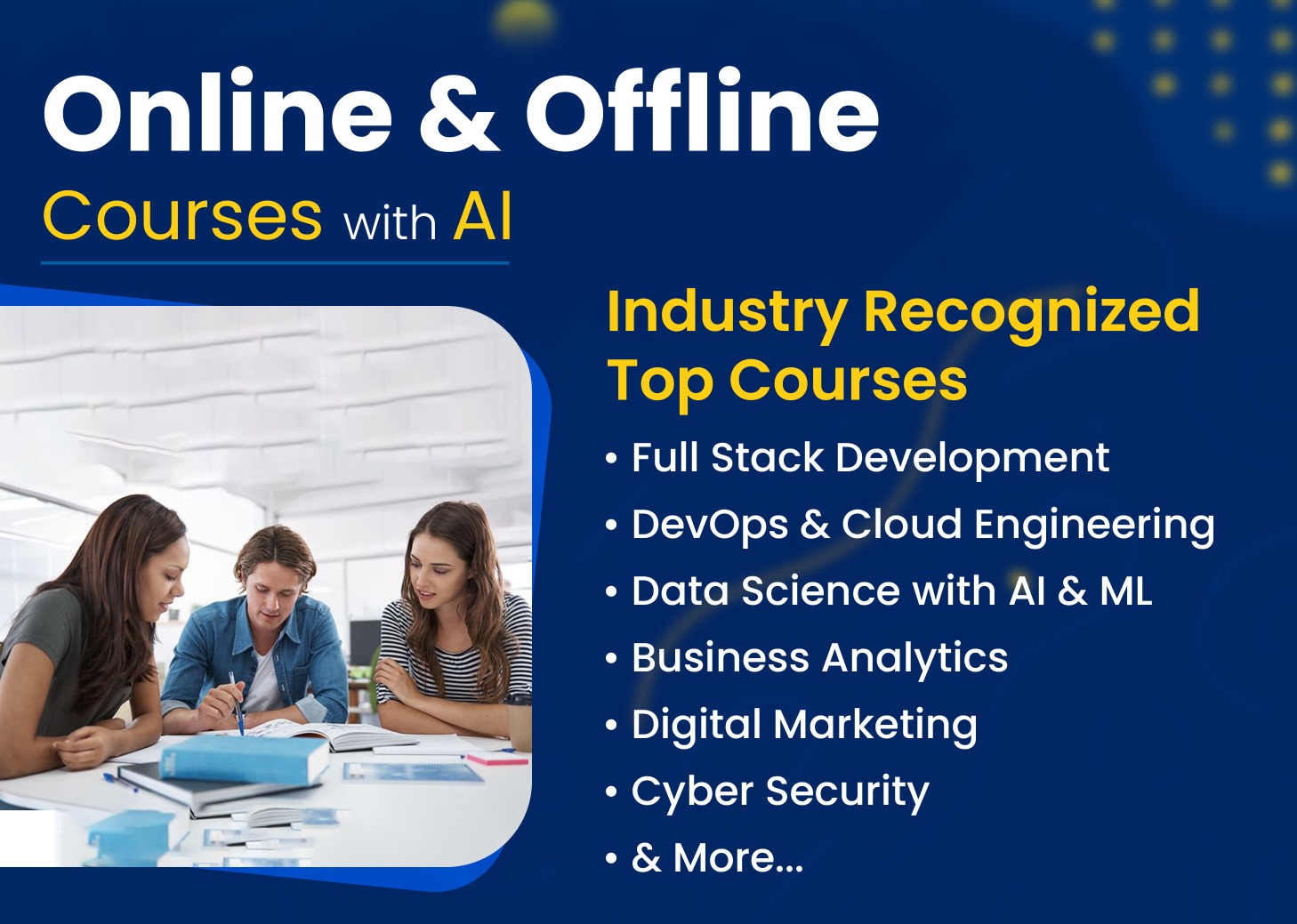 Experience the Expertise: Our renowned instructors deliver personalized guidance through live video sessions, tailored to both novice and seasoned professionals. Our extensive range of courses, featuring complimentary sessions and unbeatable webinar deals, delve into the fundamentals and advanced topics of Full Stack Development, Digital Marketing, Front-End Development, Business Analysis, and many more...