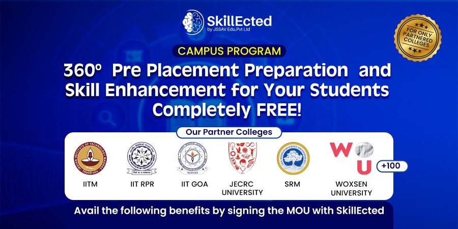 SkillEcted provides comprehensive Placement Exams designed to prepare students for recruitment by top-tier companies like Accenture, Wipro, Infosys, and many more. Our tailored exams simulate real-world recruitment tests, delivering a rigorous evaluation of candidates' skills and knowledge.